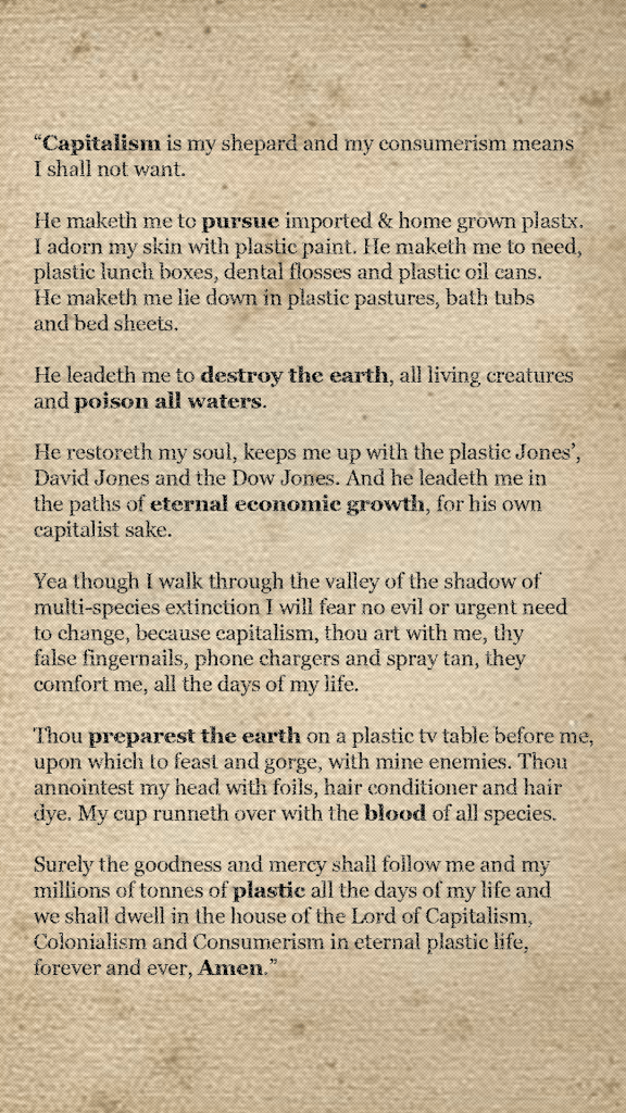 Psalm 23: The 4 Lords Are My Shepherd… X Posted byJuundaal25th Jun 202224th May 2023Posted inPerformances & Festivals, Plastic Free Biennale, WritingsTags:#anthropoceneart, #aplacetocallhome, #belonging, #caringforcountry, #ccontemporaryart, #colonialism, #confession, #contemporaryindigenousart, #covid, #decolonisation, #digitalocene, #empowerment, #enmeshment, #entanglements, #environmentalresponse, #plasticfreebiennale, #prayer, anthropocene, capitalism, consumerism, performance Juundaal Strang-Yettica, 2020, Internship: Plastic-free Biennale,2020, Lucas Ihlein & Kim Williams in NIRIN, Sydney Biennale, Image: Micky Quick & Lucas Ihlein. Your Friend, in & Out of Plastix, Sister GlitterNullius X Share this: Click to share on X (Opens in new window) X Click to share on Facebook (Opens in new window) Facebook Like Loading... Related