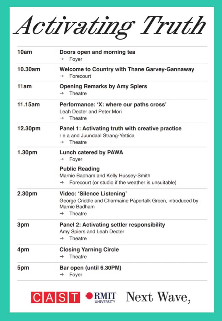 Amy Spiers: Many of us knew each other from a residency last year at Bundanon. Activating Truth is a program of creative research activities bringing together First Peoples and settler artists and researchers from across Naarm/Melbourne, other parts of so-called ‘Australia’, as well as Turtle Island/Canada, to exchange and share knowledge on ways that the truth about settler colonial violence can be activated responsibly and impactfully in community and localised contexts. The idea for the program was instigated by Amy Spiers, and is an attempt to bring a range of separate conversations together on truth-telling and decolonisation through creative practice, and forge stronger partnerships and closer networks that can support, and deepen, all of our ongoing research in this space.